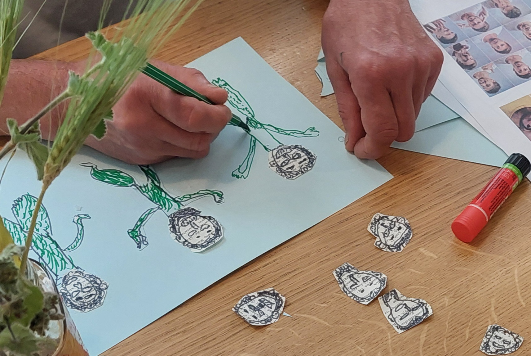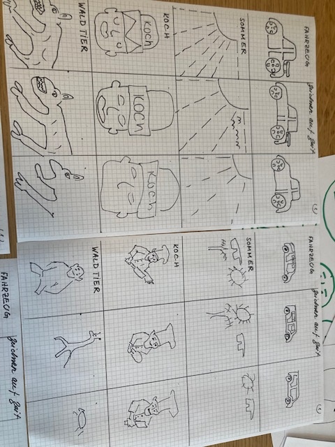 Die gezeichneten Köpfe und Körper wurden schliesslich ausgeschnitten. So konnten die Teilnehmer sie frei kombinieren und mit verschiedenen Varianten spielen: Wie wirkt ein Kopf auf einem bestimmten Körper, und wie verändert sich der Gesamtausdruck der Figuren, wenn wir die Köpfe tauschen? Was passiert, wenn ein Kopf höher oder tiefer zu liegen kommt, gerade oder schief?