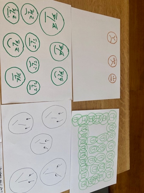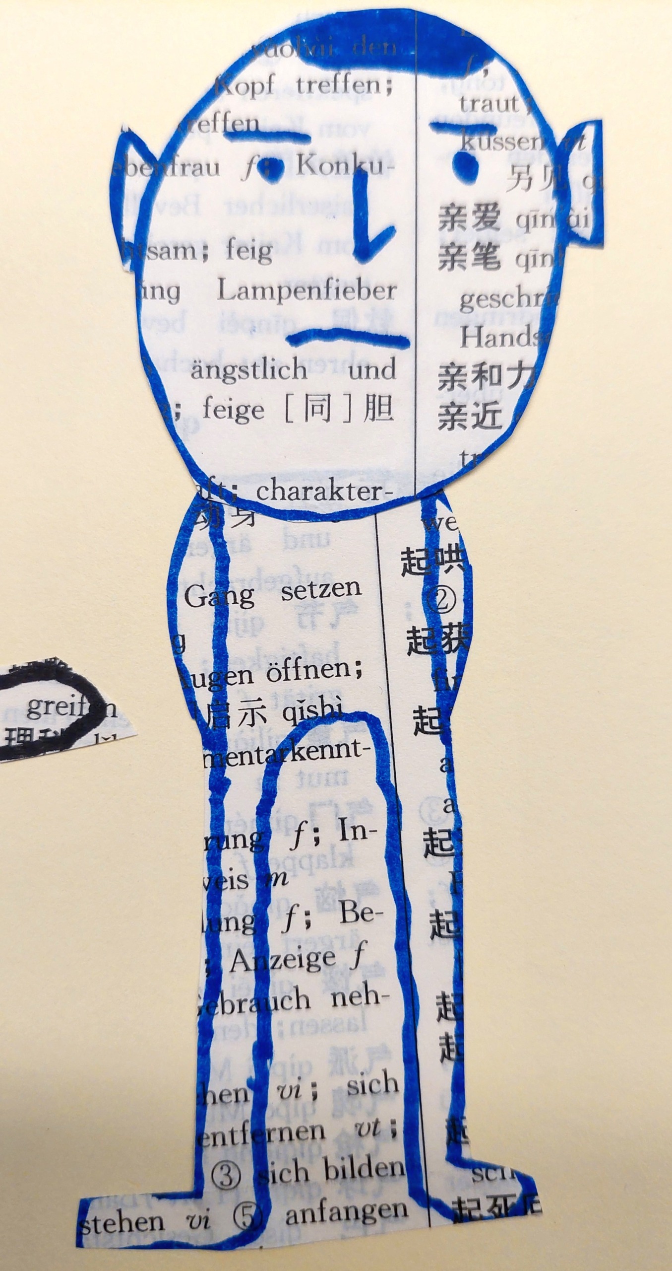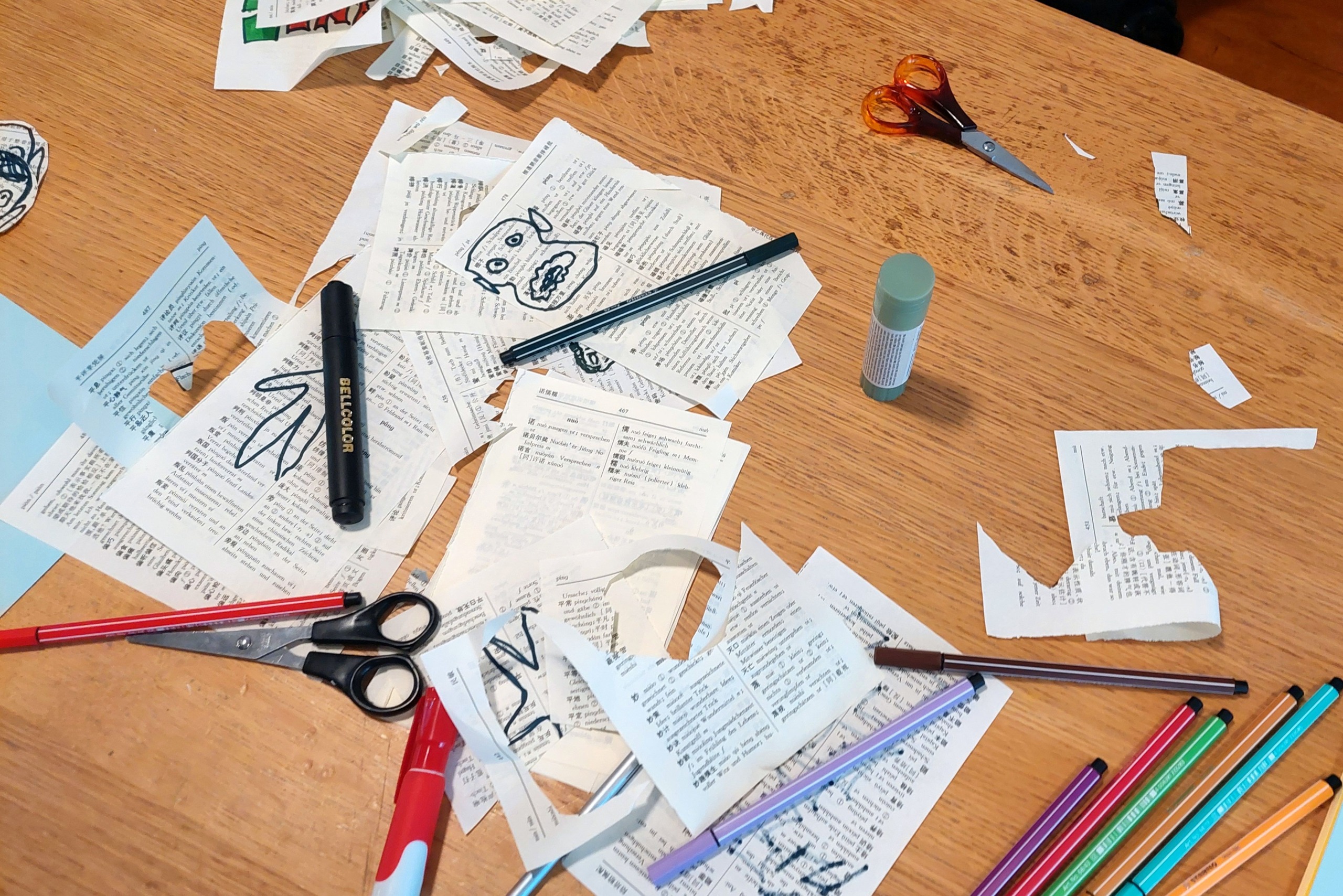 Nach einem kurzen Austausch über den Ausdruck von Emotionen zeichnete jeder Teilnehmer eine Serie unterschiedlicher Gesichter. Gezeichnet wurde mit Filzstift auf bedrucktem Papier aus einem Chinesisch-Deutsch-Wörterbuch.