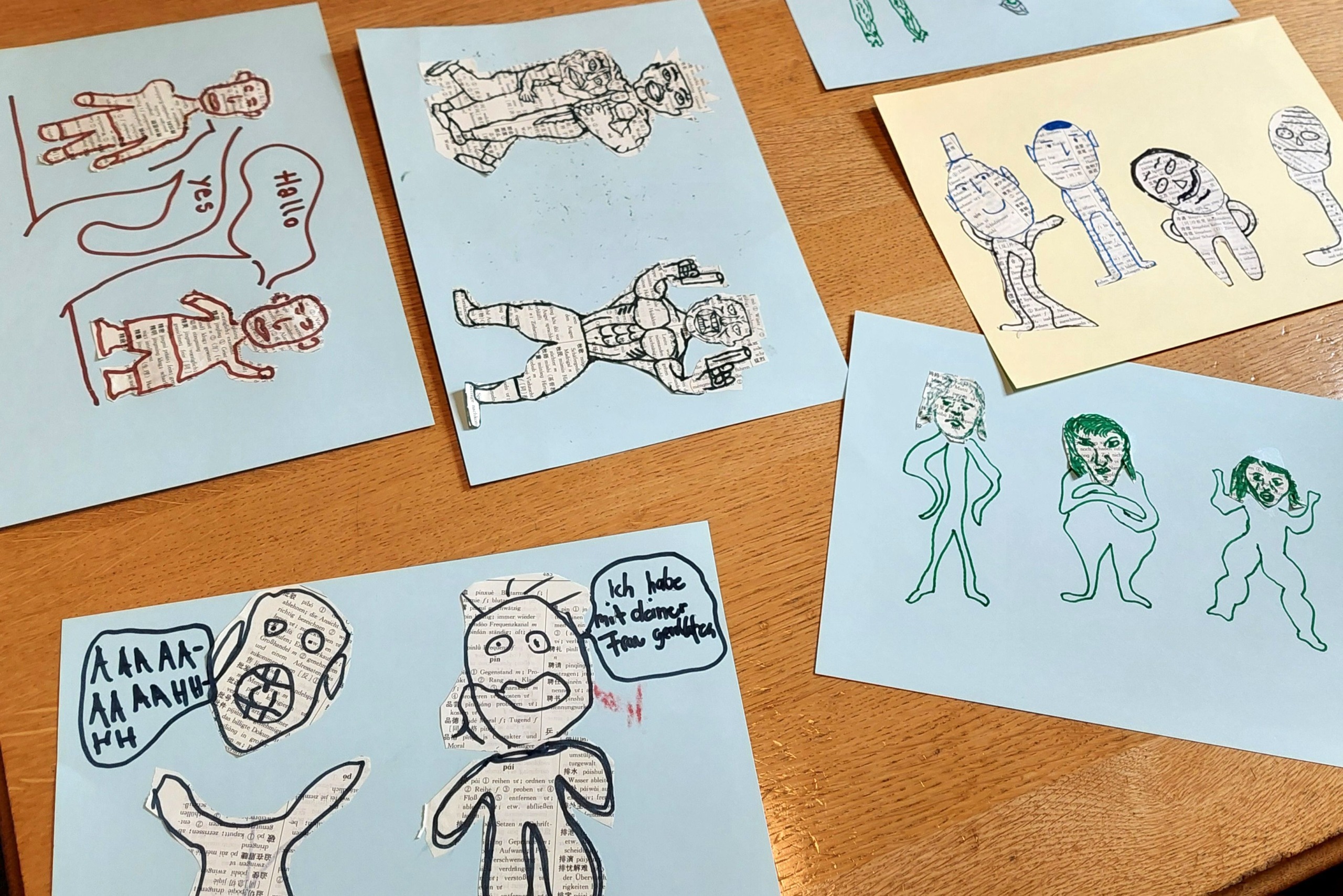 Nachdem die Teilnehmer ihre Charaktere festgelegt hatten, setzten sie die endgültigen Figuren auf einem Blatt Papier in Beziehung zueinander und klebten sie auf. Manche Figuren bekamen zusätzlich eine Sprechblase. Andere sollen ausschliesslich über ihre Körpersprache kommunizieren. Die durchschimmernden Wörter aus dem Wörterbuch fügen den Zeichnungen rein zufällig da oder dort noch etwas unbeabsichtigten Witz hinzu.
