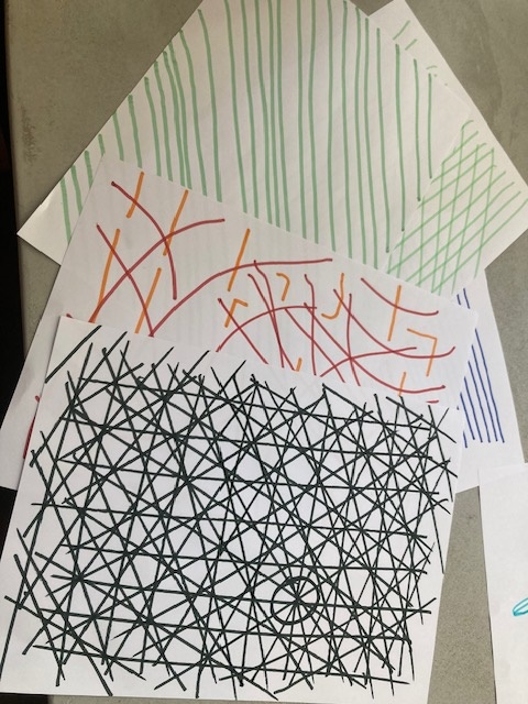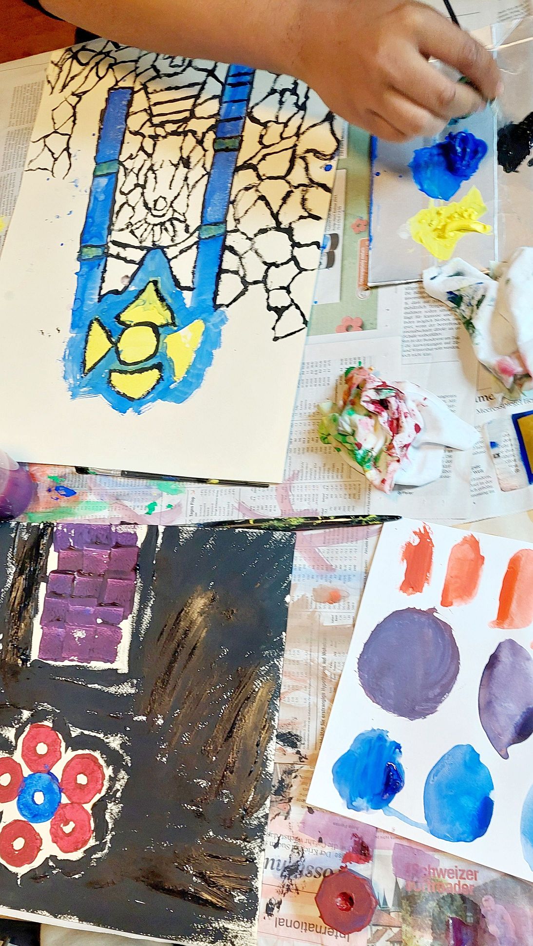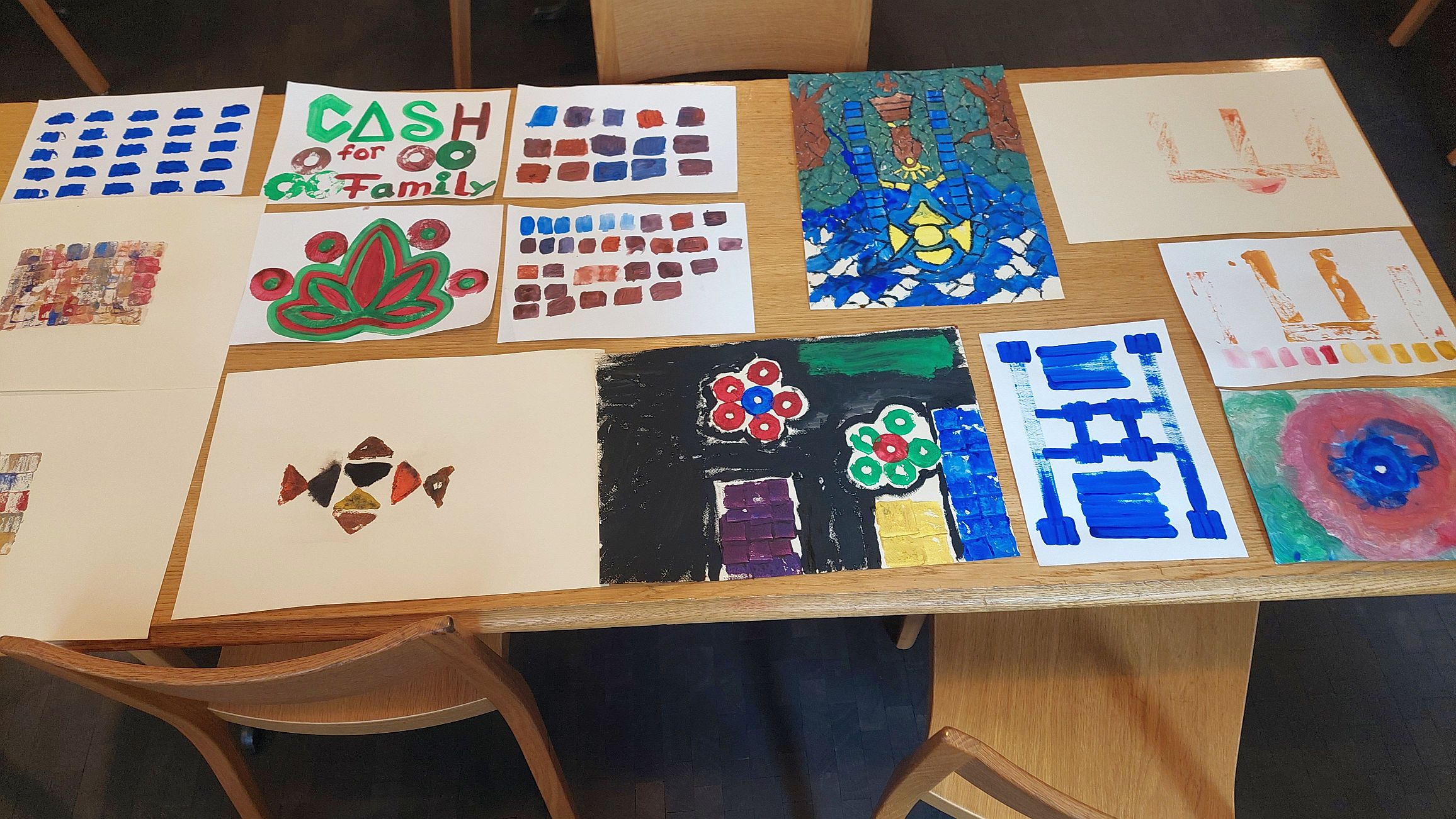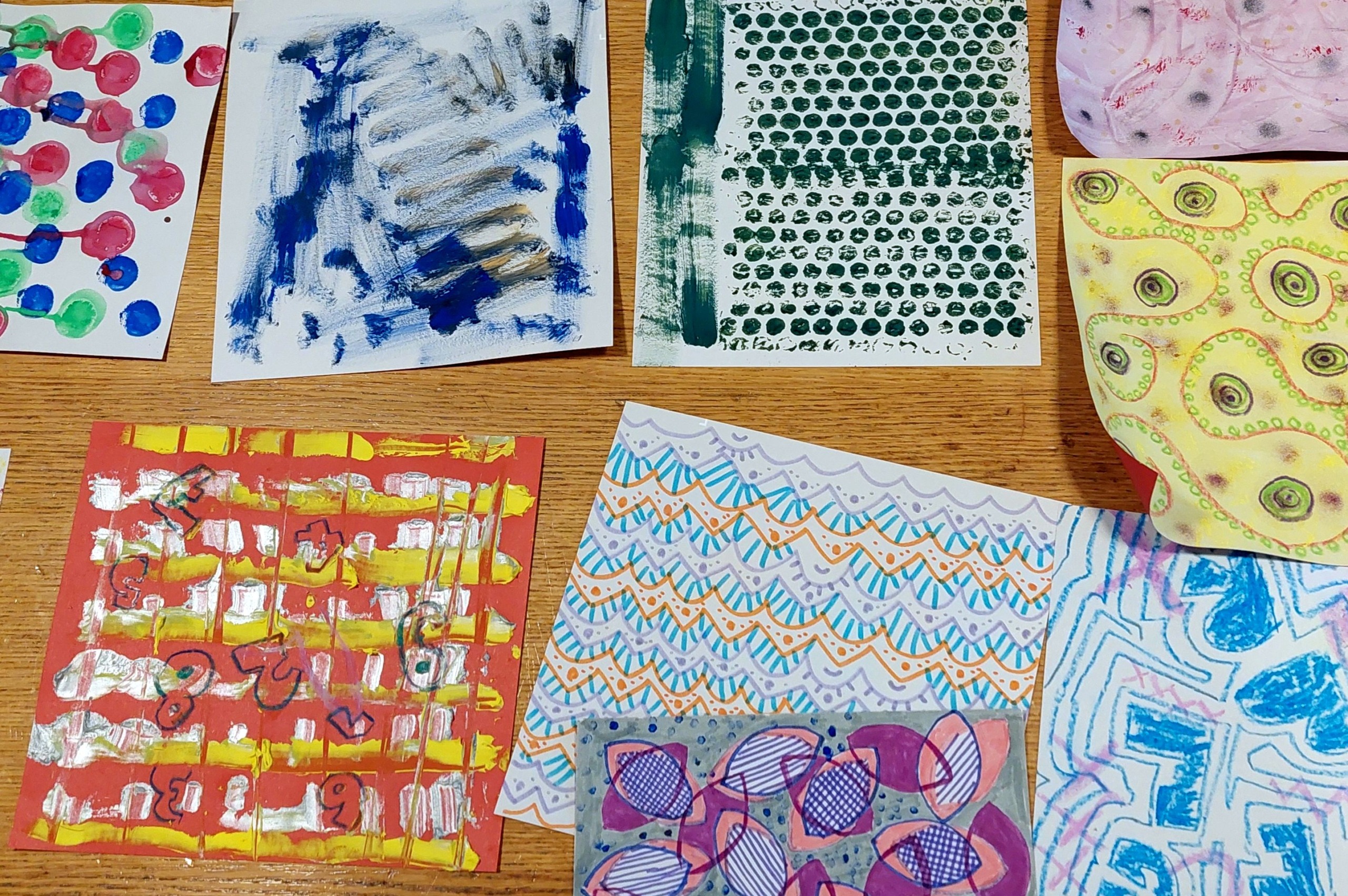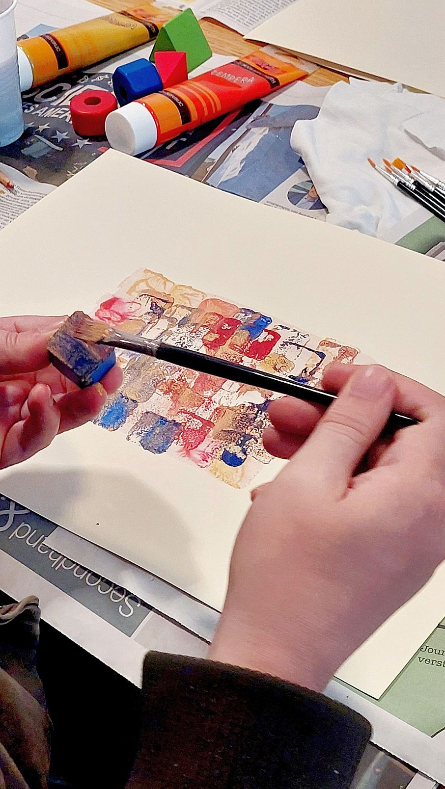 Die Teilnehmer waren aufgefordert, mit verschiedenen Materialien und Techniken zu experimentieren. So wurde mit Gouache-Farbe, Pinsel und Filzstiften gemalt, gemischt und gestempelt. Während die einen sich wiederholende Muster sorgfältig aufs Papier zeichneten, gingen andere grossflächig zu Werke und testeten unterschiedliche Pinselstriche und Farben aus. Wieder andere bedruckten ihr Papier mit eingefärbten Luftpolsterfolien. Auch mit Schablonen und Stempelkissen wurde experimentiert. Zum Schluss lag eine kunterbunte Sammlung an Bastelpapieren auf dem Tisch.