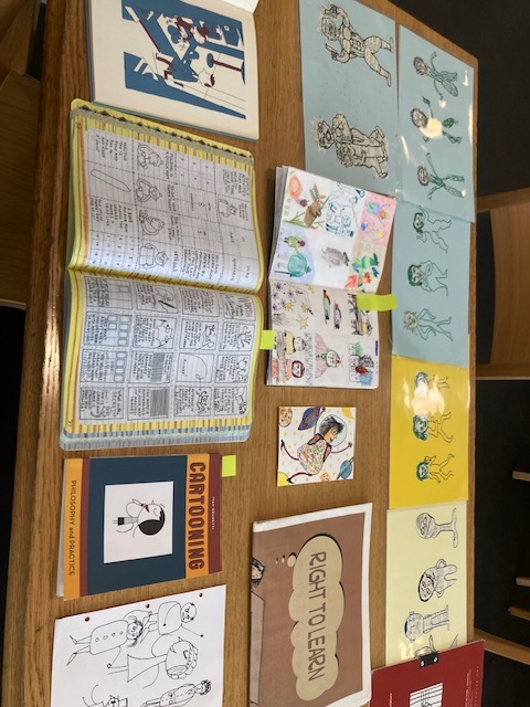 Anschauungsmaterial ausgelegt auf einem Tisch, mit Büchern und Magazinen, lud die Teilnehmer zum Schmökern ein, bevor sie sich ihren Platz mit gespitztem Bleistift, Feinliner und Papier einrichteten. Lisa brachte den Anwesenden Sharad Sharma aus Indien näher, der das Prinzip Grassroot-Comics erfand. Diese Methode ermöglicht es jeder Person, mit einfachen Mitteln, die eigene oder eine erfundene Geschichte zu erzählen. Sie lernte ihn am Fumetto Comicfestival in Luzern kennen. Der Workshop war toll und sein Wahlspruch “a single drop of ink, can make a thousand people think” an der Wandtafel inspirierend. Das Experiment sollte nun auch in der Herberge zur Heimat zum Tragen kommen.