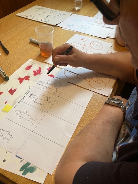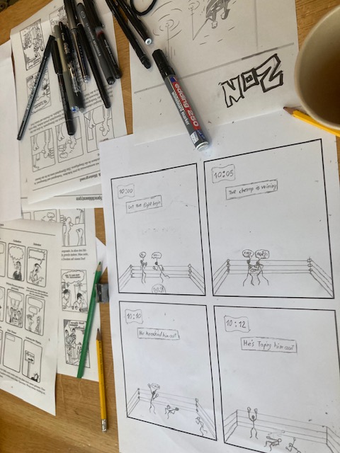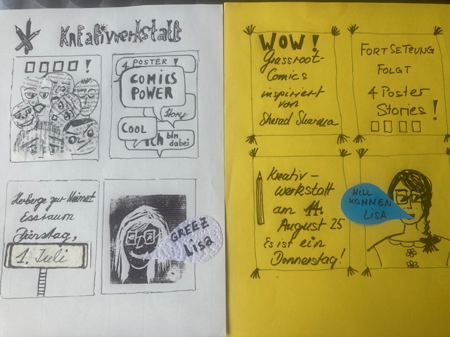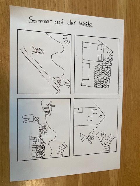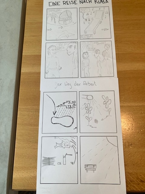 In einem weiteren Schritt näherten sich die Teilnehmer dem Vorhaben, in vier Bildern eine Geschichte zu konzipieren. Es wurde überlegt, wie in Comics Sprechblasen funktionieren, wie die Bildeinteilung sein könnte und wo allenfalls zusätzliche Informationen platziert werden sollten. Die einen machten ein Storyboard oder ein Skizze, andere wagten sich gleich ans Schlussformat. In konzentrierter Stimmung entwickelten sie ihre Story. Trotz grosser Hitze an beiden Workshoptagen waren die Anwesenden voll dabei und liessen ihrer Phantasie freien Lauf.