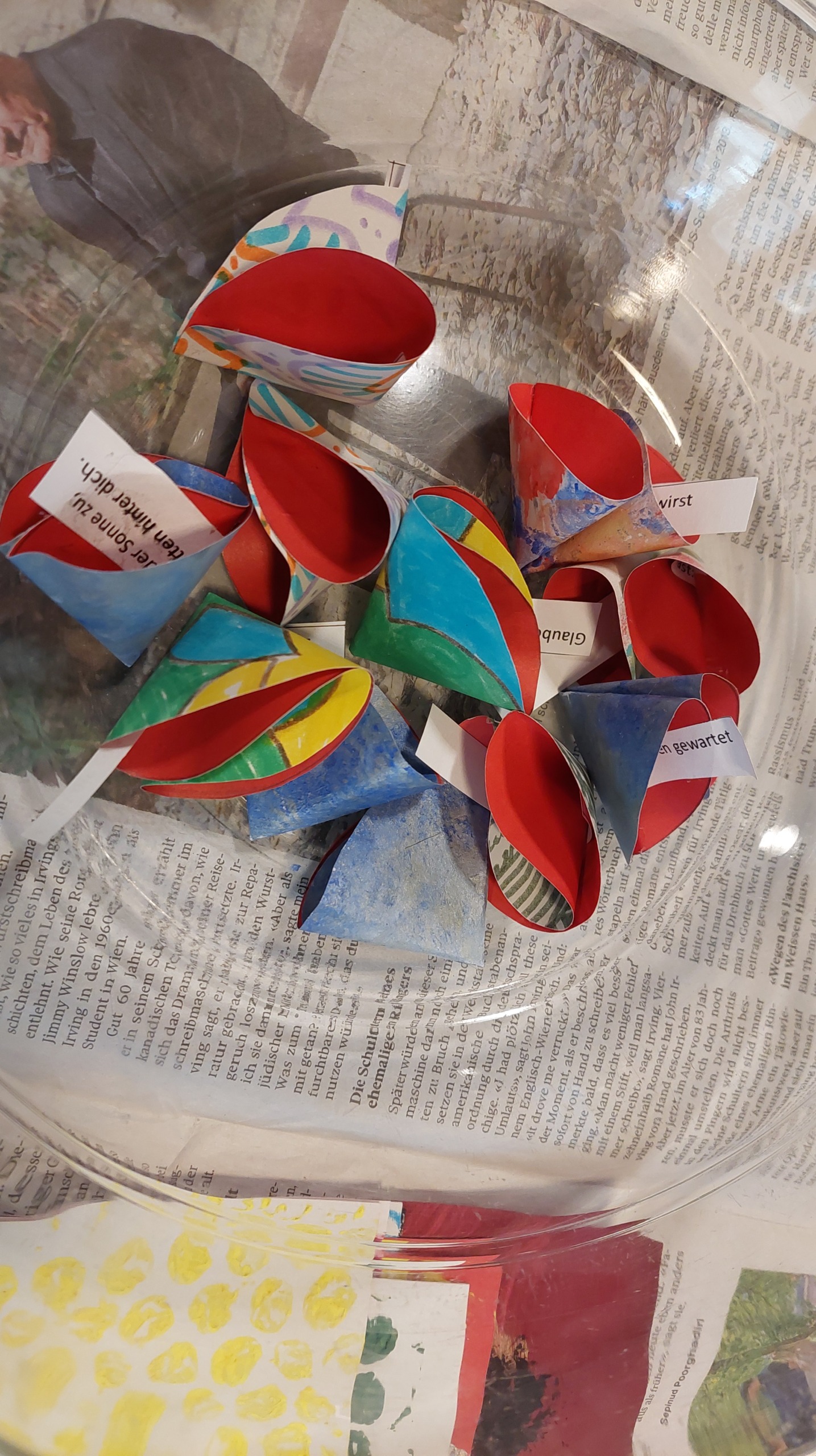 Damit daraus ein perfekt gefalteter Glückskeks entstand, musste man den Kreis einmal in der Hälfte mit einem Klebepunkt zusammenkleben und nach dem Trocknen quer dazu an einem weiteren Punkt nochmals. Dies forderte den Teilnehmern einiges an Geschick ab. Doch irgendwann hatten alle den Kniff draussen, und mit ein bisschen Übung füllte sich die Schale mit den fertigen Glückskeksen immer schneller.