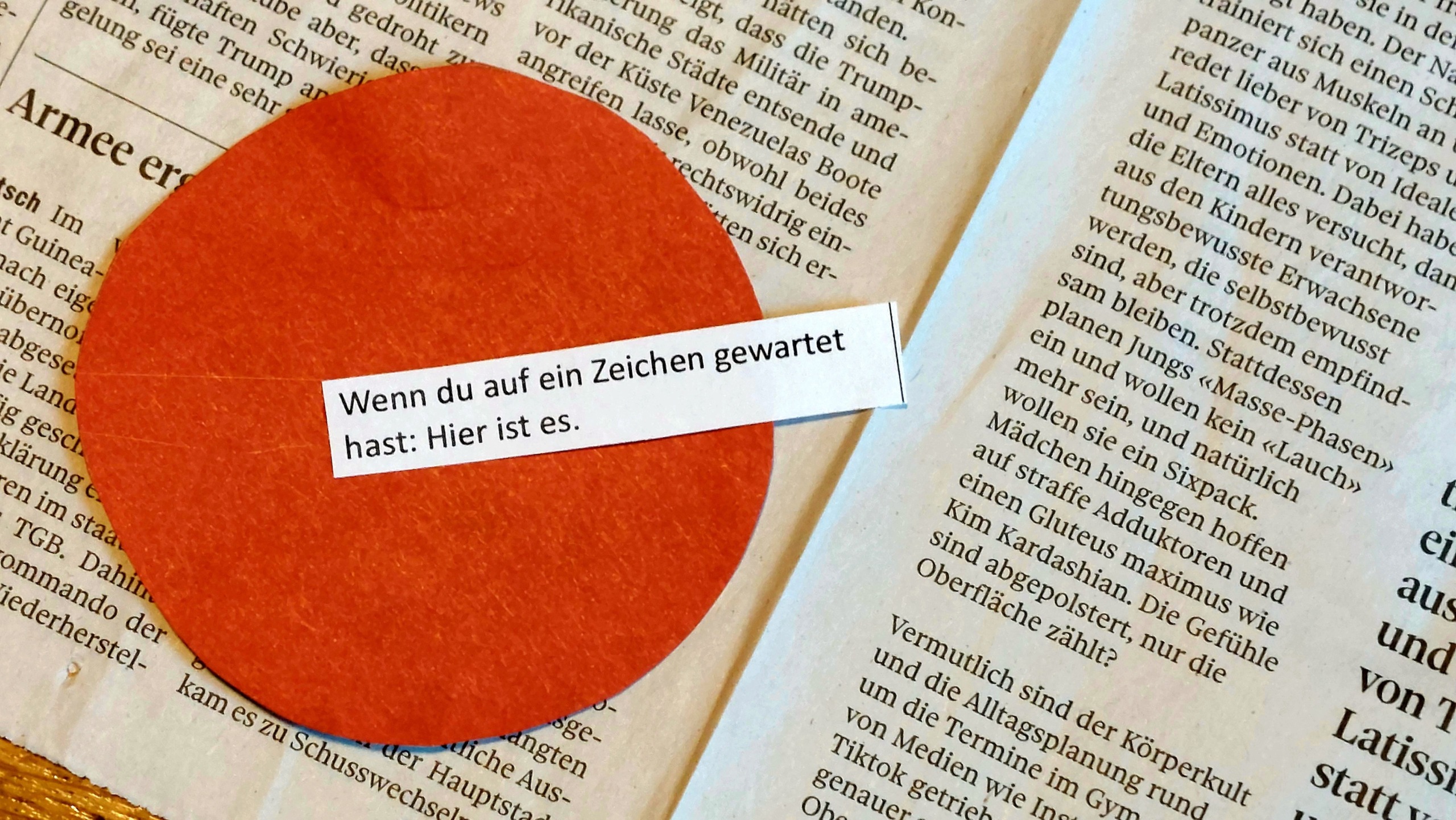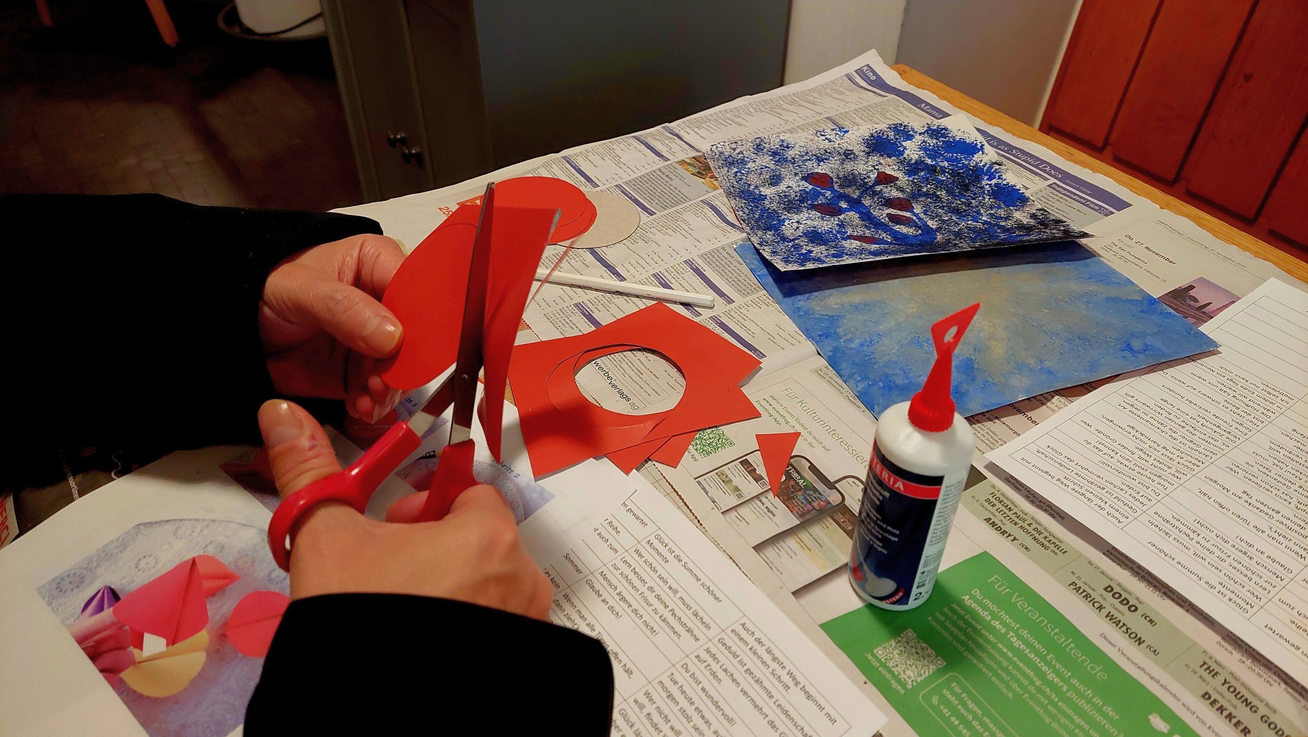Bei der folgenden Werkstatt vom 2. Dezember kamen einige dieser Papiere zum Einsatz. Die Teilnehmer schnitten daraus erst einmal kreisrunde Teile aus. Daraus sollen nach chinesischem Vorbild Glückskekse entstehen. Aus einer Liste von Sprüchen und Wünschen wählten die Männer jene aus, die ihnen besonders gut gefielen. Diese galt es auszuschneiden, um sie anschliessend auf die Innenseite der ausgeschnittenen Kreise zu kleben.